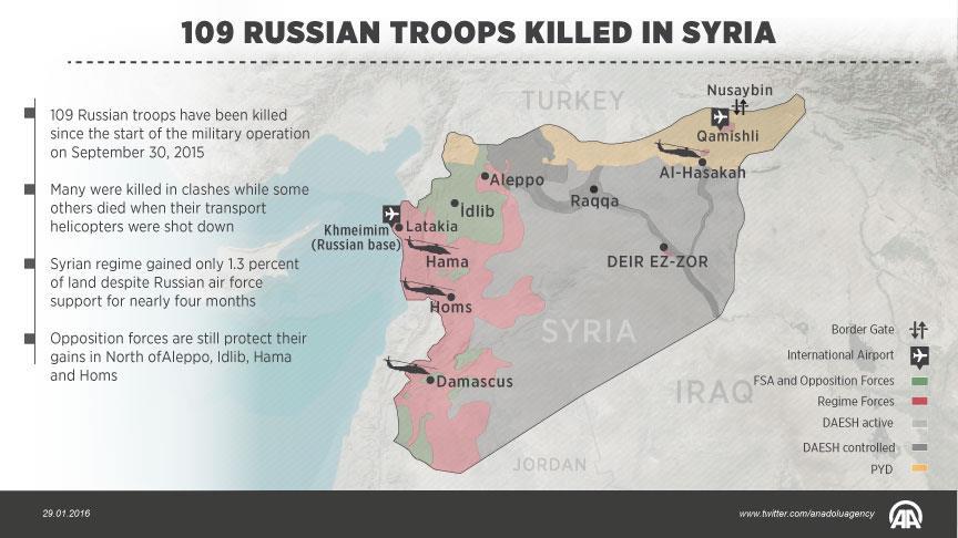 The sources told Anadolu Agency that 109 Russian troops have been killed since the start of the military operation on September 30, 2015. Many were killed in clashes while some others died when their transport helicopters were shot down, the sources said.