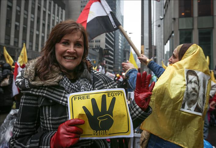 "Every time Sisi steps foot on American soil and we allow this, it is a slap in the face of democracy and freedom," she said, adding that the Rabaa sign has become a universal sign for justice.