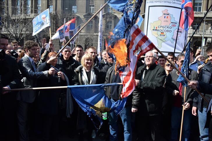 Flags representing the EU, NATO, Kosovo and U.S. were burned as about 700 people attended the rally staged by the Serbian Radical Party in the Serbian capital on Tuesday.