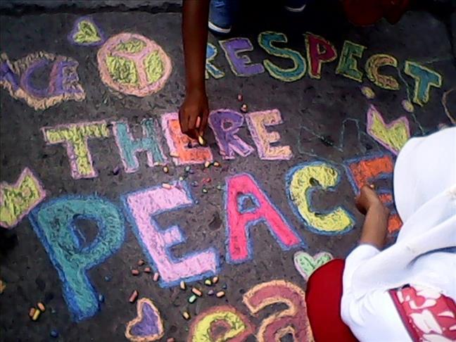 Using brushes and buckets of paint, the children accompanied by their parents drew images and wrote messages to try to express feelings in support of peace.