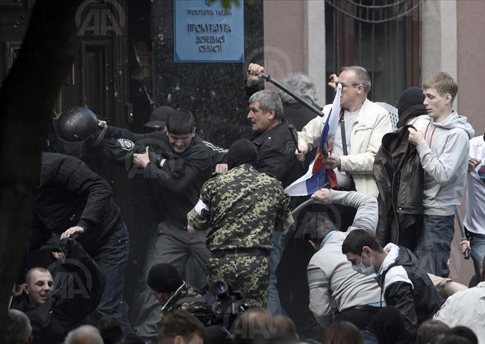 Un grand nombre de bâtiments gouvernementaux ont été saisis puis occupés par des militants pro-russes à travers l’Ukraine. Le gouvernement de Kiev affirme que ces groupes sont soutenus par la Russie, ce que cette dernière a officiellement nié.