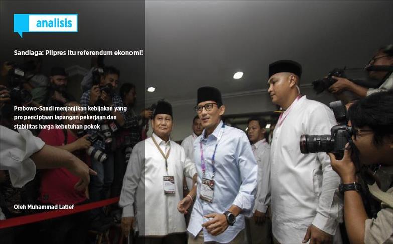 “Pemilihan presiden 2019 ini kami kerucutkan menjadi referendum tentang ekonomi. Apakah (kebijakan) ekonomi yang dijalankan pemerintah sekarang ini layak dilanjutkan atau tidak,” ujar Sandi.