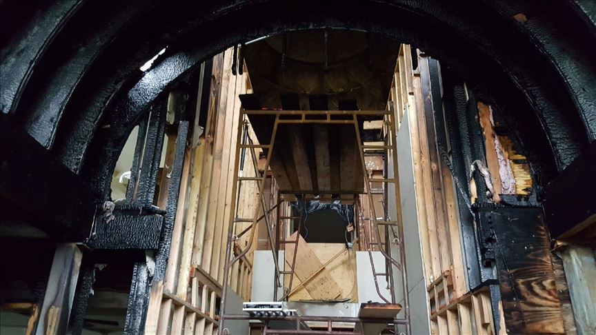 Kebakaran terjadi di lantai pertama masjid pada hari Minggu sore dan menyebar ke tingkat kedua.