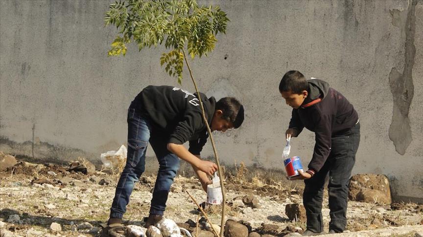 Anak-anak yang tinggal di sejumlah distrik yang berada di bawah blokade rezim Bashar al-Assad di Provinsi Homs, Suriah mengikuti kegiatan tanam pohon untuk menggantikan pohon yang terpaksa mereka bakar guna menghangatkan diri selama musim dingin.