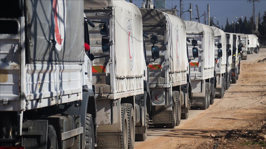 Truk-truk yang penuh dengan bantuan kemanusiaan memasuki Suriah melalui gerbang perbatasan Cilvegozu di Provinsi Hatay, selatan Turki, yang berbatasan dengan Provinsi Idlib.