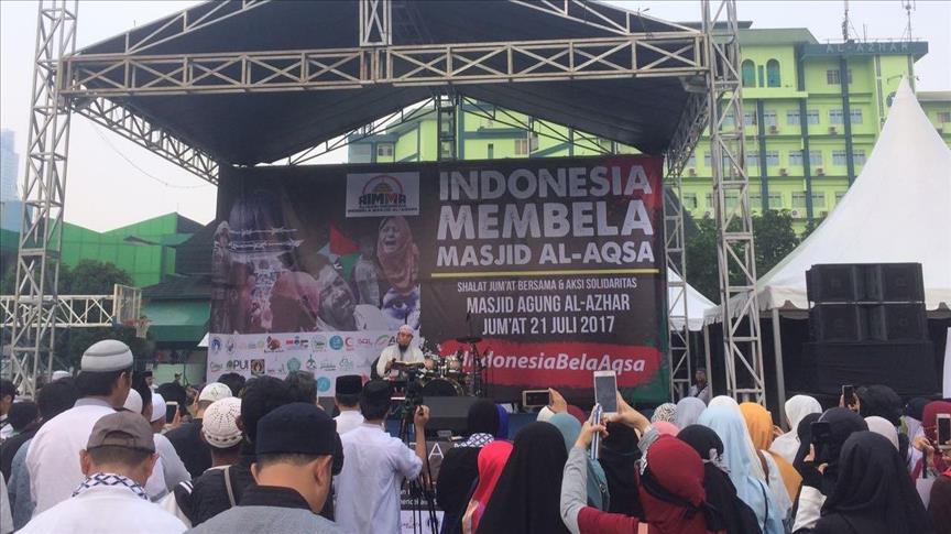 Ribuan massa di Jakarta berkumpul untuk mendukung masyarakat Palestina. Massa yang berasal dari Jadebotabek ini mengecam tindakan Israel yang menutup kompleks masjid Al-Aqsa.