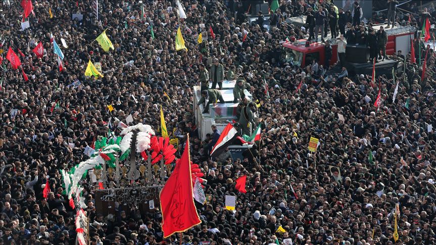 Ribuan pelayat meneriakkan slogan "Kematian bagi Amerika" dan "Kematian bagi Israel" sambil mengibarkan spanduk yang menuntut balas dendam untuk Soleimani.