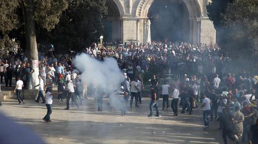 Warga Palestina yang menyambut gembira setelah hampir dua pekan menggelar aksi protes terhadap kebijakan Israel, masuk ke kompleks melalui gerbang Bab Hutta, namun mereka yang sudah berada di dalam mulai melempari batu setelah mereka mendengar bunyi granat kejut dari jalur menuju gerbang.