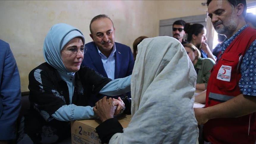 Ibu Negara Turki Emine Erdogan membagi-bagikan bantuan kepada pengungsi Rohingya Muslim pada kunjungannya ke kamp dekat perbatasan Myanmar pada Kamis.