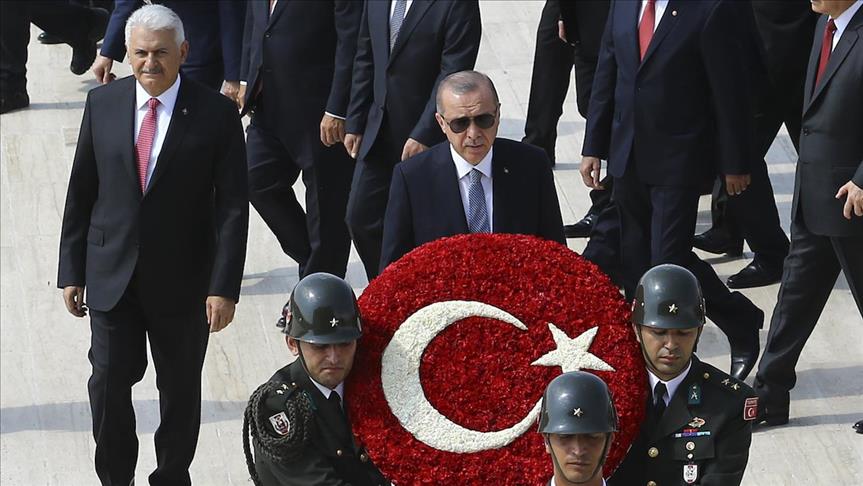 Presiden Recep Tayyip Erdogan, pejabat senior, pejabat tinggi militer dan pemimpin oposisi meletakkan karangan bunga di Anitkabir, makam pendiri Republik Turki Mustafa Kemal Ataturk di Ibu Kota Ankara.