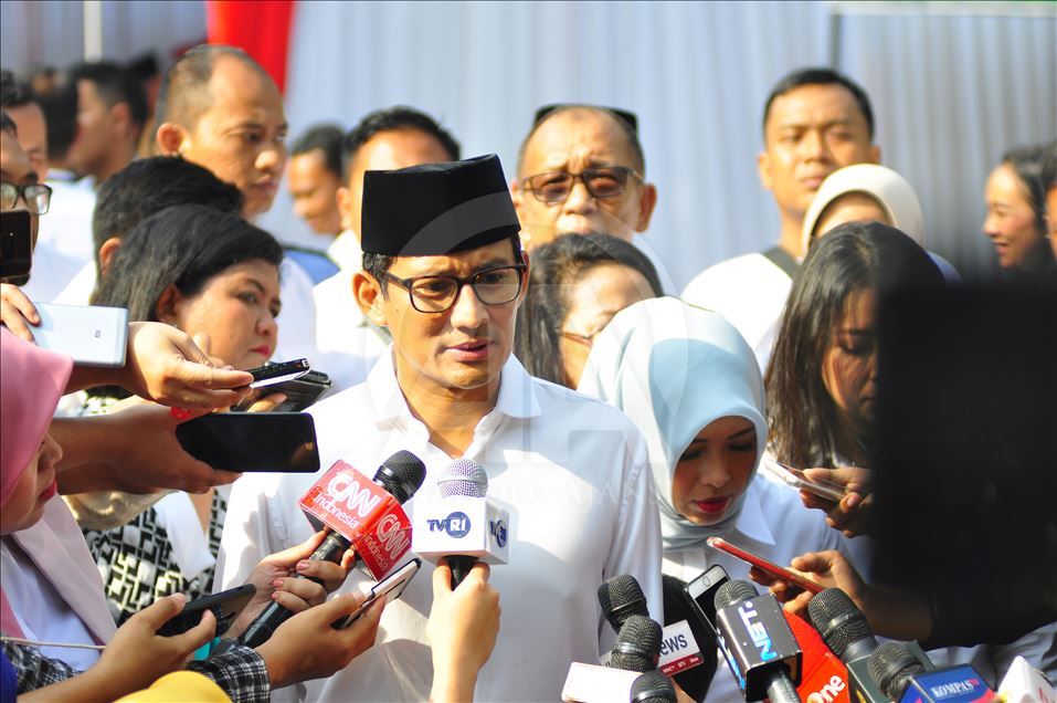 Calon wakil presiden Sandiaga Uno berbicara kepada media sebelum memberikan suara di Jakarta, Indonesia pada 17 April 2019. Hari ini rakyat Indonesia melalukan pemilihan umum secara serentak untuk memilih presiden dan wakil presiden serta anggota Dewan Perwakilan Rakyat (DPR), Dewan Perwakilan Daerah dan dewan provinsi dan kota (DPRD).