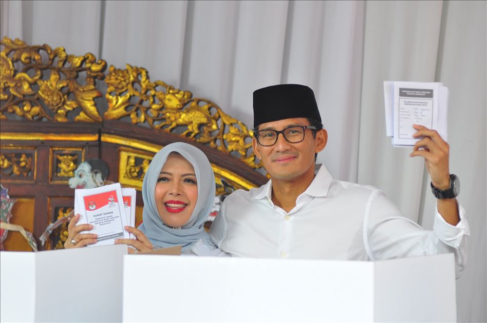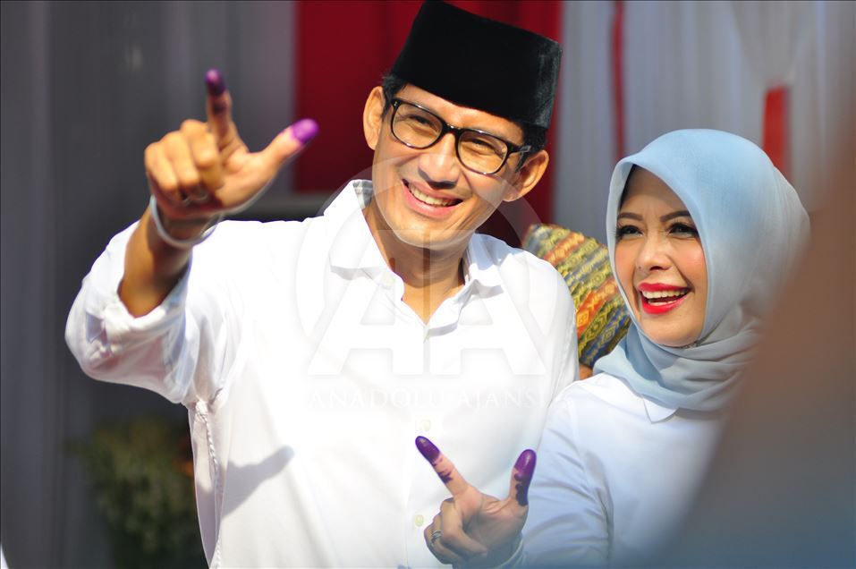 Calon wakil presiden Sandiaga Uno menunjukkan jari mereka setelah memberikan suara di Jakarta, Indonesia pada 17 April 2019. Hari ini rakyat Indonesia melakukan pemilihan umum secara serentak untuk memilih presiden dan wakil presiden serta anggota Dewan Perwakilan Rakyat (DPR), Dewan Perwakilan Daerah dan dewan provinsi dan kota (DPRD). Riky Sultana