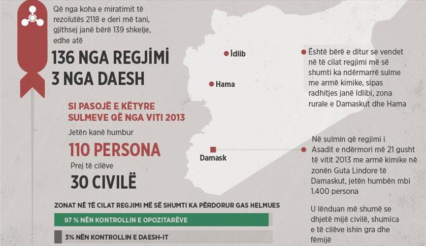STAMBOLL (AA) - Rrjeti i të Drejtave të Njeriut në Siri (SNHR) deklaroi se, vendimin e Këshillit të Sigurimit të Kombeve të Bashkuara që ndalon përdorimin e armëve kimike, brenda tre viteve e ka shkelur 136 herë, raporton Anadolu Agency (AA).
