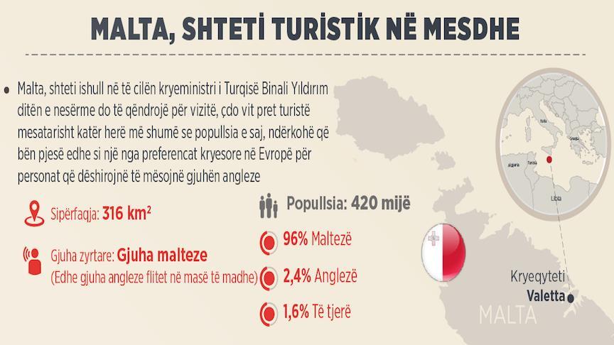 Malta, shteti ishull në të cilën kryeministri i Turqisë Binali Yıldırım ditën e nesërme do të qëndrojë për vizitë, çdo vit pret turistë mesatarisht katër herë më shumë se popullsia e saj, ndërkohë që bën pjesë edhe si një nga preferencat kryesore në Evropë për personat që dëshirojnë të mësojnë gjuhën angleze, shkruan Anadolu Agency (AA).