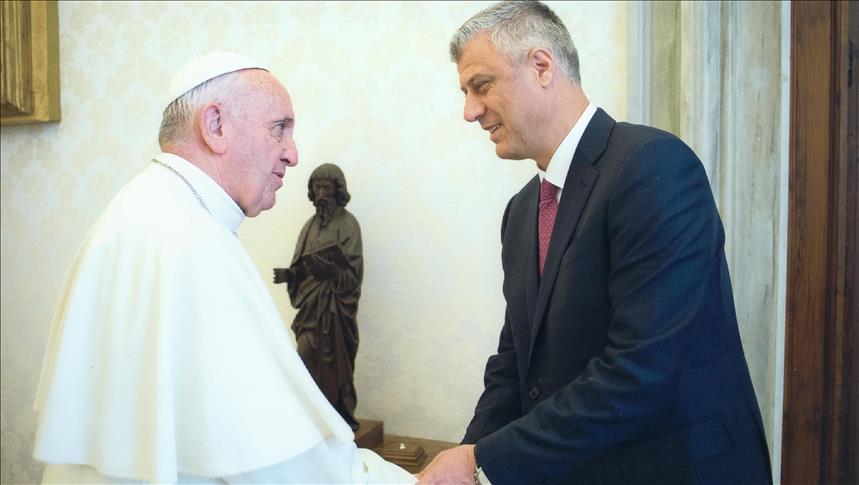 Në një njoftim zyrtar nga Presidenca e Kosovës, thuhet se Thaçi, në një audiencë private është pritur nga Papa Françesku, në Vatikan, ku presidenti i Kosovës u shpreh se po ky vend përfaqëson vlerat për të cilat është duke u angazhuar Kosova, si pajtimi, paqja, bashkëpunimi dhe toleranca.