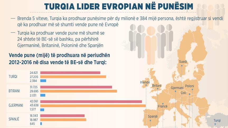 Turqia është regjistruar si vendi që ka prodhuar më së shumti vende të punës brenda pesë viteve në periudhën 2012-2016. Konkretisht, në këtë periudhë Turqia ka prodhuar punësime shtesë për dy milionë e 384 mijë persona.