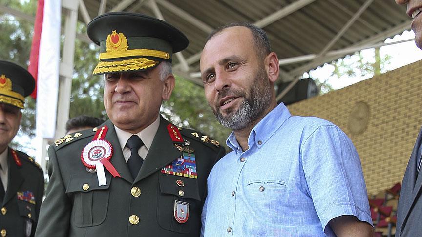 Fetullahçı Terör Örgütü'nün (FETÖ) darbe girişiminde bulunduğu 15 Temmuz gecesi darbeci askerlerin açtığı ateş sonucu İstanbul'daki 15 Temmuz Şehitler Köprüsü'nde ayağından yaralanan Hakan Doğru, Zırhlı Birlikler Okulu ve Eğitim Tümen Komutanlığında düzenlenen yemin törenine katılan Eğitim ve Doktrin (EDOK) Komutanı Korgeneral Tahir Bekiroğlu'nun elini öptü.