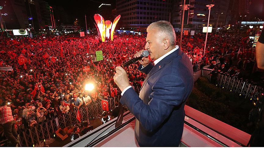 Yıldırım, Kızılay Meydanı'nda Fetullahçı Terör Örgütü'nün (FETÖ) darbe girişimini protesto etmek amacıyla toplanan vatandaşlara hitap etti.