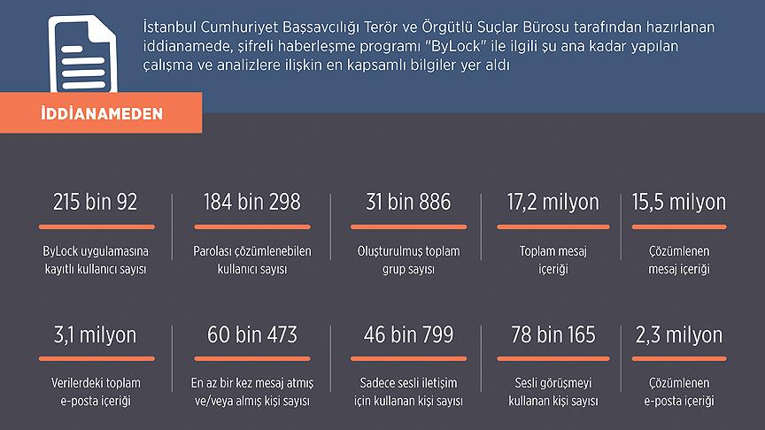İddianamede, ByLock uygulaması üzerinde yapılan çalışmalar sonucu, bütün çağrı hareketleri, mesajlaşma, mailleşme ve rehber bilgileri tablolarına ilişkin elde edilen şu verilere de yer verildi: