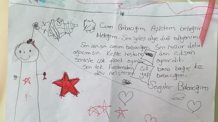 Çenesinden kurşunla yaralanan, Göztepe Eğitim ve Araştırma Hastanesinde geçirdiği 3 ameliyatın ardından tedavisi devam eden Deveci'nin kızı Zeynep'in babasına yazdığı mektup, hastane odasındaki duvara asıldı.