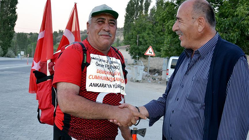 Malatyalı 67 yaşındaki Ömer Fişekçi, Fetullahçı Terör Örgütü'nün (FETÖ) darbe girişimini protesto etmek, Cumhurbaşkanı ve demokrasiye sahip çıkmak için Ankara'ya yürüyor.