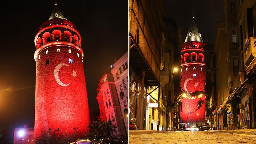 İstanbul'un sembolleri arasında yer alan kule, Fetullahçı Terör Örgütü'nün (FETÖ) 15 Temmuz darbe girişiminin birinci yılında ışıklandırıldı.