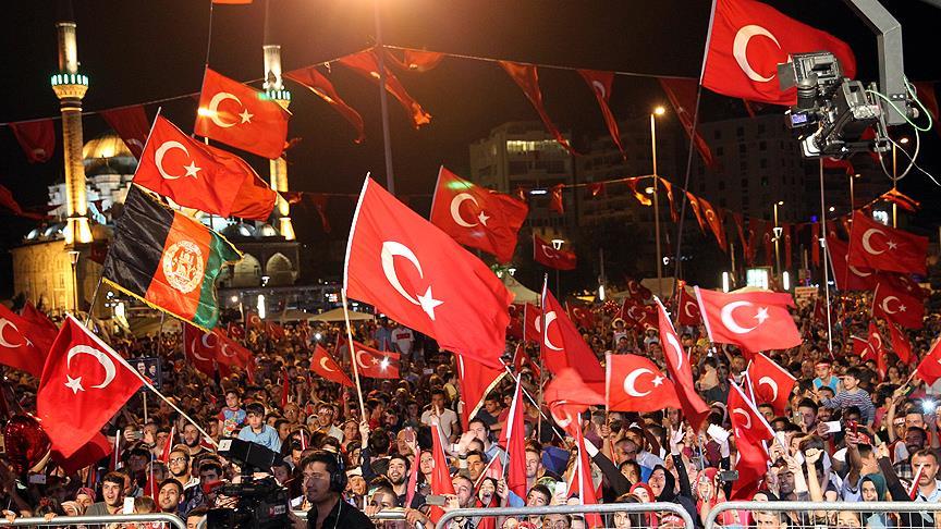 Sivil toplum kuruluşlarının öncülüğünde meydanda bir araya gelen vatandaşlar, ellerinde Türk bayraklarıyla darbe girişimine tepki gösterdi. Cumhurbaşkanı Recep Tayyip Erdoğan'ın çağrısı ile darbeye karşı tek ses, tek yürek olmayı sürdüren vatandaşlar, mehter takımının marşlarına eşlik etti.