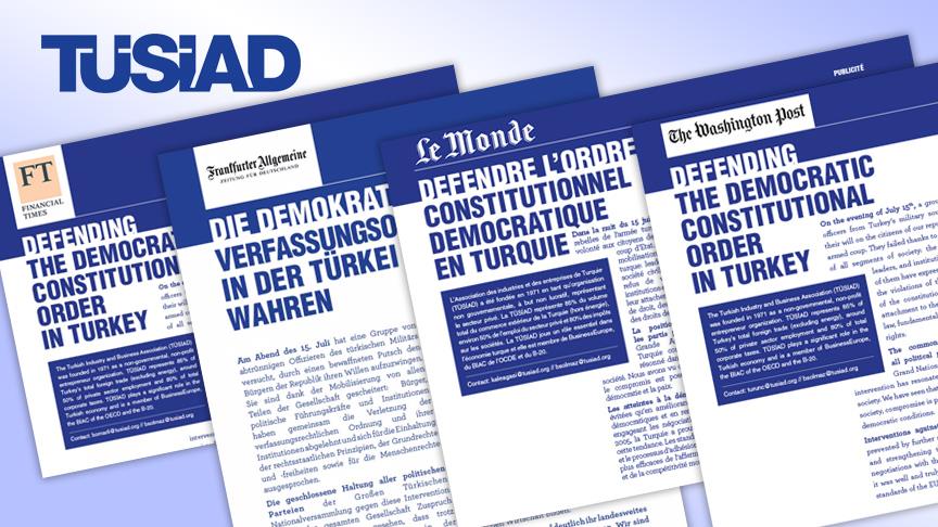 Türk Sanayicileri ve İşadamları Derneği (TÜSİAD), Fetullahçı Terör Örgütü'nün (FETÖ) darbe girişiminin ardından uluslararası kamuoyunu Türkiye ile ilgili doğru yönlendirebilmek ve Türkiye algısını güçlendirmek amacıyla ABD, Almanya, Fransa ve İngiltere’nin önemli gazetelerinde “Türkiye'de Demokratik Anayasal Düzeni Korumak” başlıklı bir ilan yayımladı.