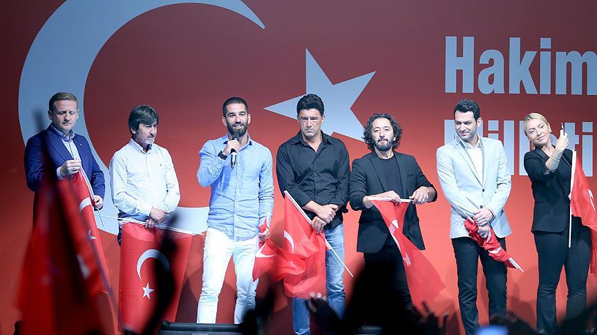 Milli Takım Kaptanı Arda Turan da şehitlere Allah'tan rahmet dileyerek, "Biz ne kadar yüce bir milletiz. Siz hepimizin kahramanısınız, gerçek kahramanlar sizlersiniz. Bu ülkenin demokrasisine sahip çıktınız. Benim milletime yakışan budur. Siz liderinize yakışır şekilde davrandınız. Biz Müslümanız, ayıbı örteceğiz, gece gibi olacağız. Birlik olacağız, beraber olacağız. Siz canlarsınız. O yüzden hep beraber bu demokrasiyi en güzel şekilde, Cumhurbaşkanımızla beraber yaşatacağız." dedi.