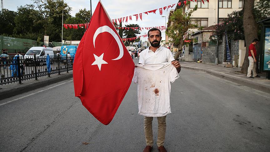 Elinde Türk bayrağı, üzerinde şehitler ile yaralananların kanının bulunduğu tişörtüyle darbe girişimine tepki gösteren Karakoyun, AA muhabirine yaptığı açıklamada, darbe girişiminin ardından Cumhurbaşkanı Erdoğan'ın çağrısı üzerine Boğaziçi Köprüsü'ne gittiğini belirtti.