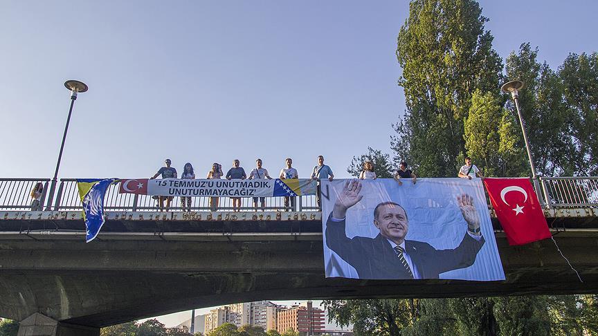 Dernek üyeleri, Zenica'daki Kamberovic Köprüsü'ne "15 Temmuz'u unutmadık, unutturmayacağız" yazılı afişin yanı sıra Cumhurbaşkanı Recep Tayyip Erdoğan'ın fotoğrafı ve iki ülke bayraklarını astı.