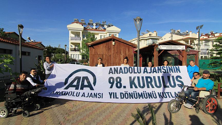Fethiye Bedensel Engellilerle Dayanışma Derneği üyeleri, dernek binası önünde toplanarak, "Anadolu Ajansının 98. kuruluş yıl dönümünü kutluyoruz" yazılı pankartı açtı.