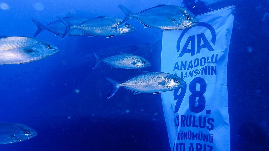 Dalgıçlar, denizin 32 metre derinliğinde "Anadolu Ajansının 98. kuruluş yıldönümünü kutlarız" yazılı pankart açtı.