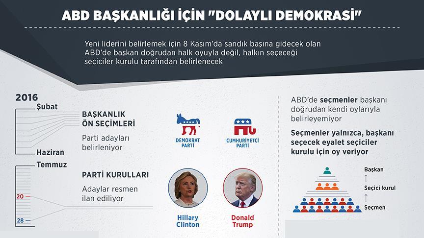 Dünyanın birçok demokratik ülkesinde uygulanan doğrudan demokrasi yerine seçimlerde "dolaylı demokrasi" uygulayan ABD'de halk, doğrudan başkan adayları yerine seçiciler kurulunu belirlemek üzere sandık başına gidecek.