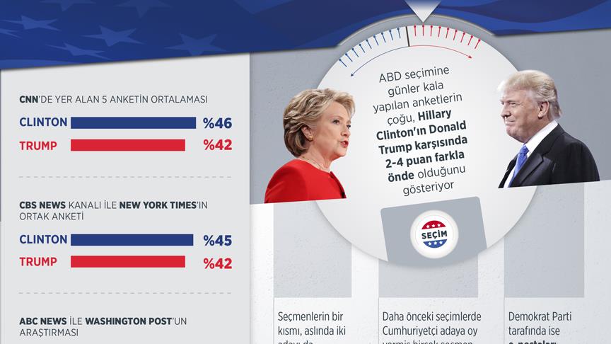 Clinton, CBS News kanalı ile New York Times gazetesinin ortak anketinde de yüzde 45'e yüzde 42 önde görünüyor. ABC News ile Washington Post gazetesinin araştırmasında, Hillary Clinton'ın yüzde 47, Trump'ın ise yüzde 45 oy alacağı öngörülüyor.