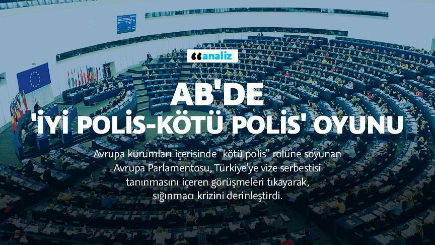 Avrupa kurumları içerisinde "kötü polis" rolüne soyunan Avrupa Parlamentosu (AP), Türkiye karşıtlarının yoğun propagandası sayesinde Komisyon'un tavsiye kararına rağmen Türkiye'ye vize serbestisi tanınmasını içeren görüşmeleri tıkayarak, kıta tarihinin en ciddi sığınmacı krizini daha da derinleştirdi.
