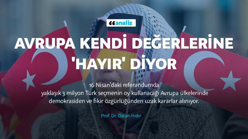 16 Nisan'daki referandumdan önce çalışmalar hız kazanırken, yaklaşık 3 milyon Türk seçmenin oy kullanacağı Avrupa ülkelerinde demokrasiden ve fikir özgürlüğünden uzak kararlar alınıyor. Nitekim Bekir Bozdağ’ın Almanya’daki referandum konuşmasına yasak getirilmesinin ardından, yasakçı ülkeler kervanına Hollanda, Avusturya ve Belçika gibi ülkeler de katıldı. Bütün bunlar, Avrupa’nın 16 Nisan’da referandumda ‘evet’ sonucu çıkmasından ne derece tedirgin olduğunun açık göstergeleri olsa gerek.