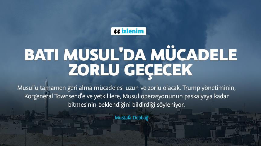 Musul'u tamamen geri alma mücadelesi uzun ve zorlu olacak. Trump yönetiminin, Korgeneral Townsend'e ve Iraklı yetkililere, Musul operasyonunun paskalyaya kadar bitmesinin beklendiğini bildirdiği söyleniyor. Askeri kaynakların da kabul ettiği üzere, bu neredeyse imkansız; mücadele büyük ihtimalle Haziran ortalarına kadar sürecek.