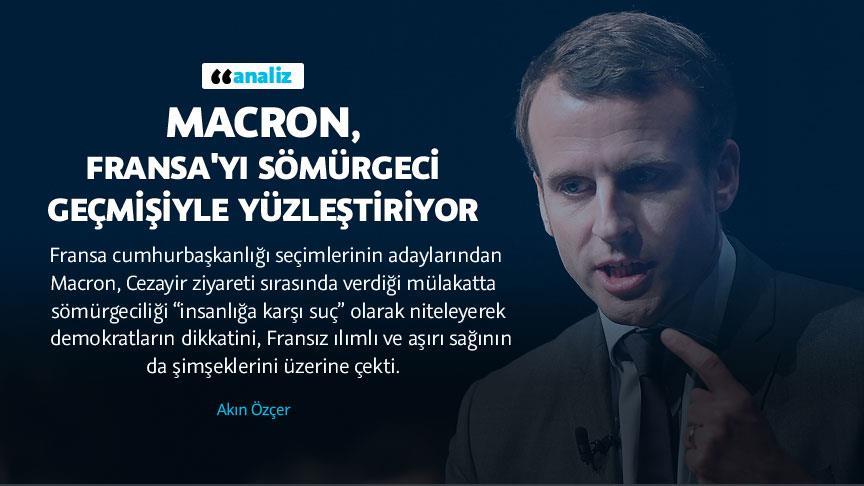 Fransa cumhurbaşkanlığı seçimlerinin favori adaylarından Emmanuel Macron, iki hafta önceki Cezayir ziyareti sırasında söyleşi yaptığı yerel Echorouk News televizyon kanalında sömürgeciliği “insanlığa karşı suç” olarak niteleyerek demokratların dikkatini, Fransız ılımlı ve aşırı sağının da şimşeklerini üzerine çekti.