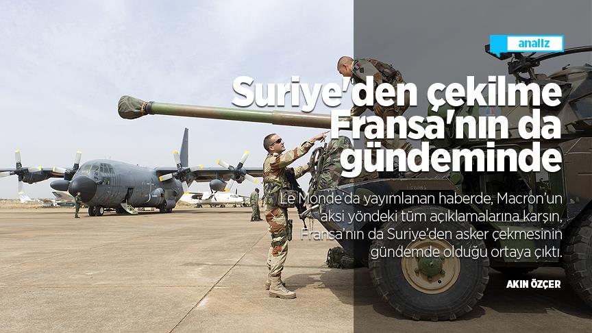 Le Monde’da 25 Ocak Cuma günü yayımlanan, “Fransız ordusunun Irak-Suriye bölgesinden çekilmesi öngörülenden daha karmaşık görünüyor” başlığını ve Nathalie Gibert’in imzasını taşıyan özel haberden, Macron’un aksi yöndeki açıklamalarına karşın, Fransa’nın da Suriye’den asker çekmesinin gündemde olduğu anlaşılıyor. Trump’ın çekilme kararının askeri makamların planlarını alt üst ettiğine değinen haber, “Nasıl gitmek ya da nasıl kalmak? ABD güdümlü Suriye’ye müdahale koalisyonunda yer alan Fransız askeri varlığı sonuna yaklaşıyor. Bu iki olasılık genelkurmay başkanlıkları düzeyinde halen Washington ile Paris arasında tartışılıyor” cümleleriyle başlıyor. Son cümleden, “bir formül bulunursa orada kalırız” anlamı da çıkıyor elbette.
