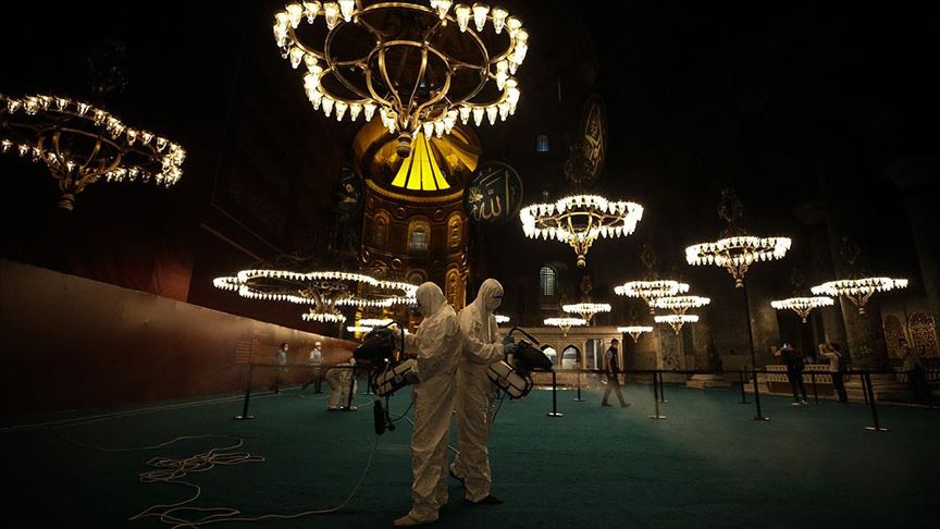 Fatih Belediyesi ekipleri, yatsı namazının ardından Ayasofya-i Kebir Cami-i Şerifi'ne gelerek dezenfekte çalışması yaptı.