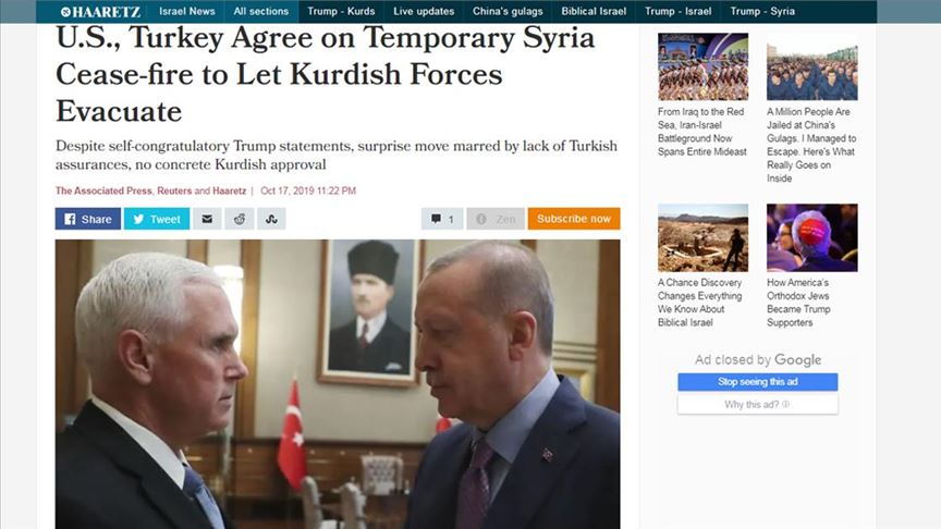Haaretz gazetesi dünkü anlaşma için "ABD ve Türkiye, Kürtlerin bölgeyi boşaltması için geçici 'ateşkeste' anlaştı" başlığını kullandı.
