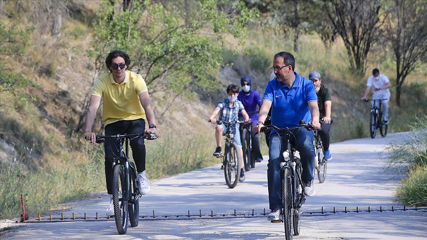 Anıttepe'den Eymir Gölü'ne geçen Bakan Kasapoğlu ve Cedi, göl kenarındaki yürüyüş yolundan bisiklet ile ODTÜ kayıkhanesine geçti.