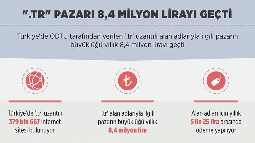 AA muhabirinin Bilgi Teknolojileri ve İletişim Kurumu (BTK) ile ODTÜ tarafından hazırlanan raporlardan derlediği bilgilere göre, Türkiye'de ".tr" uzantılı 379 bin 667 internet sitesi bulunuyor. Bu alan adları için yıllık 5 ile 25 lira arasında ödeme yapılıyor.