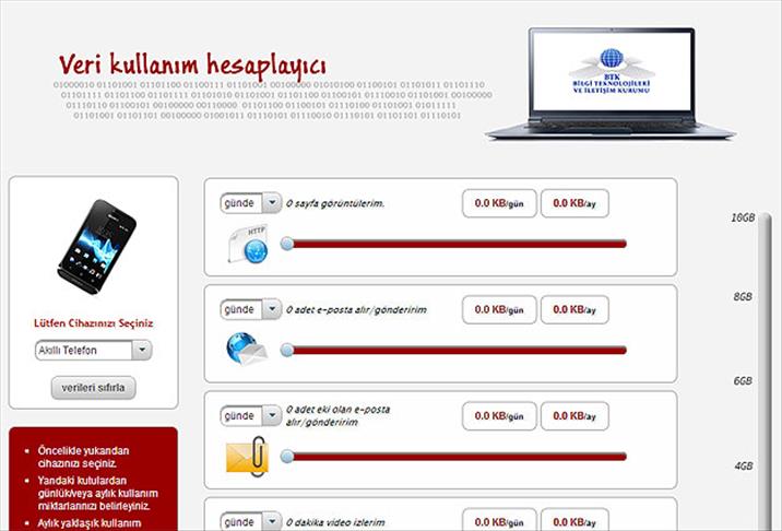 Bilgi Teknolojileri ve İletişim Kurumu (BTK), tüketicilerin mağduriyetini önlemek için yeni bir uygulamayı hayata geçirdi. BTK'nın internet sayfasında yer alan Veri Kullanım Hesaplayıcı sayesinde, tüketiciler, aylık ya da günlük görüntüledikleri sayfa sayısını, gönderdikleri e-posta adedini, izledikleri toplam video ve dinledikleri müzik süresini, yüklediği sosyal medya içerikleri, oyun oynadıkları zamanı ve diğer kullanımlarını girerek, ne kadar veri kullandıklarını hesaplayabilecek.