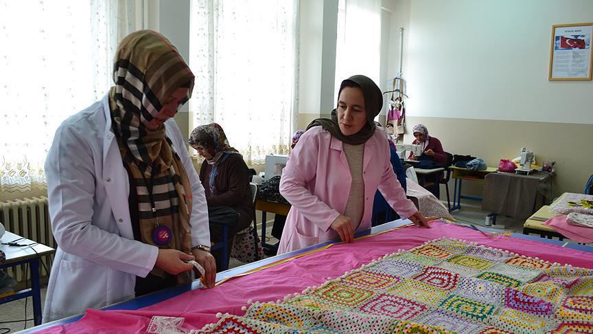 Halk Eğitim Merkezi kurs öğretmenlerinden Nazife Ayhan ise atölyede eğitime katılan kadınlarla aile ortamı oluştuğuna işaret ederek, "Burası giyim atölyemiz. Mefruşat, el sanatları, rölyef, ahşap boyama kurslarımızı burada veriyoruz. Velilerimiz sabah çocuklarıyla gelir, sınıfa bıraktıktan sonra üst kata çıkarak atölyedeki işlerinin başına geçerler. Burada iş önlüğü, okullar için masa örtüsü, folklor kıyafetleri ve çeşitli siparişlere yönelik dikim yapıyoruz." ifadelerini kullandı.