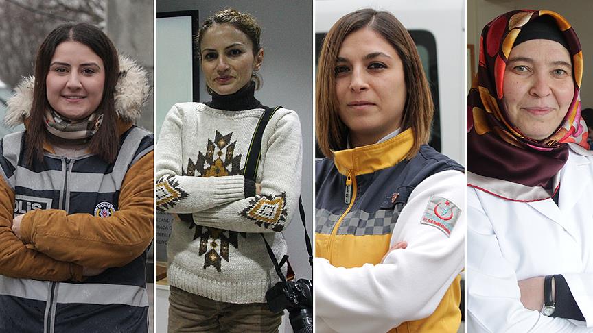 AA ekibi, 8 Mart Dünya Kadınlar Günü dolayısıyla, polis, sağlık personeli, hakem, öğretmen ve gazeteci olarak çalışan kadınların zorlu mesaisine tanıklık etti.