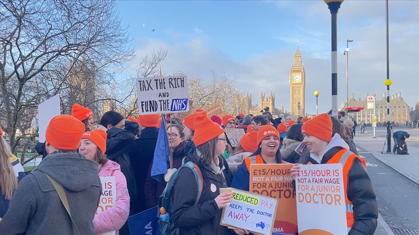 Londra'nın St. Thomas Hastanesi önünde toplanan İngiliz Tabipler Birliği (BMA) üyesi pratisyen hekimler, 2008 yılından bu yana aldıkları enflasyonun altında kalan zamları, hükümetin uzlaşmaz yaklaşımını ve yeterli seviyede personel bulunmamasını protesto etti.