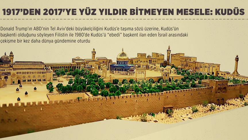 Beyaz Saray, ABD Başkanı Donalp Trump'ın, "ABD'nin Kudüs'ü İsrail'in başkenti olarak tanıdığını ilan edeceğini" ve "Tel Aviv'deki Amerikan Büyükelçiliğinin Kudüs'e taşınması talimatı verdiğini söyleyeceğini" açıkladı. Bunun üzerine başkenti Kudüs olan Filistin ile 1980’de Kudüs’ü “ebedi” başkent ilan eden İsrail arasındaki çekişme bir kez daha dünya gündemine oturdu.