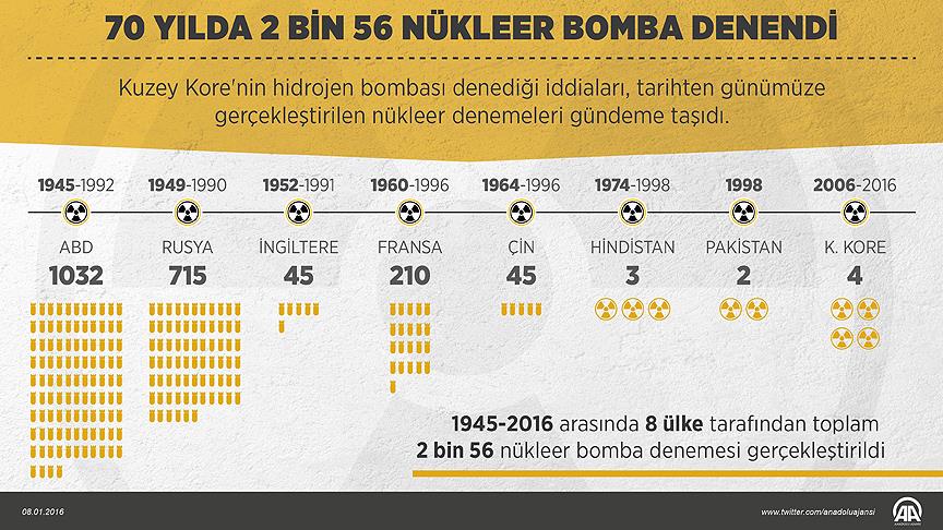 Nükleer Denemelerin Kapsamlı Yasaklanması Antlaşması Örgütü (CTBTO) verilerine göre 1945'ten günümüze kadar 2 bin 56 nükleer deneme gerçekleştirildi.